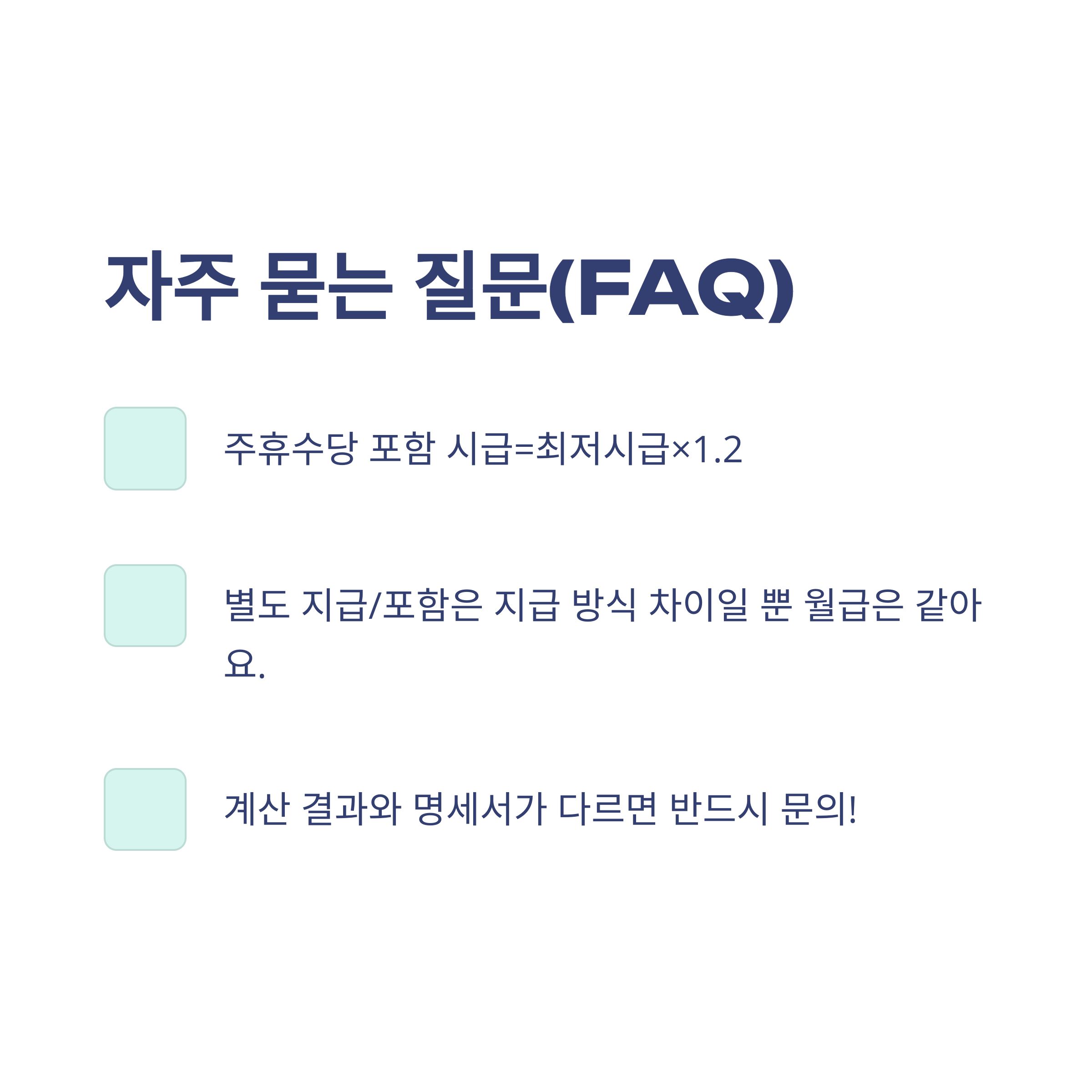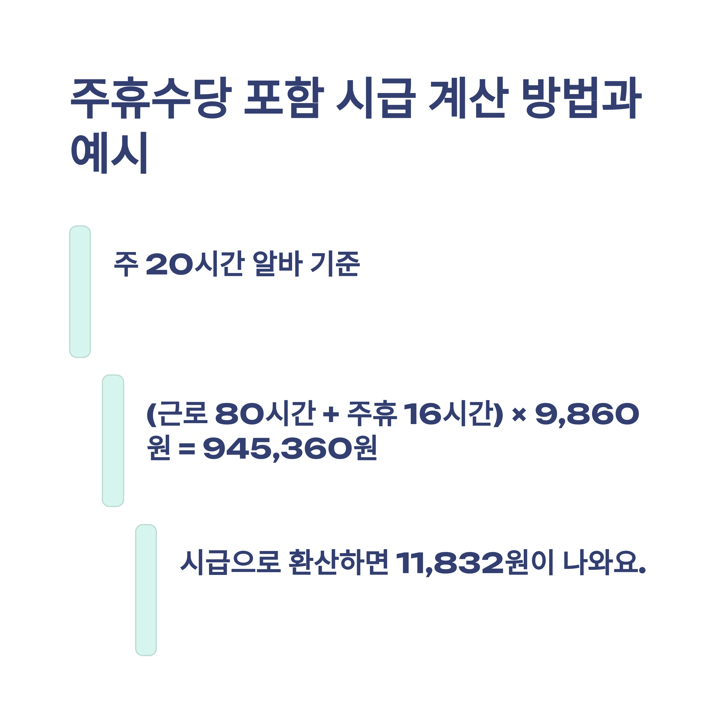 - 주휴수당 포함 시급 공식: 최저시급 × 1.2 = 주휴수당 포함 시급