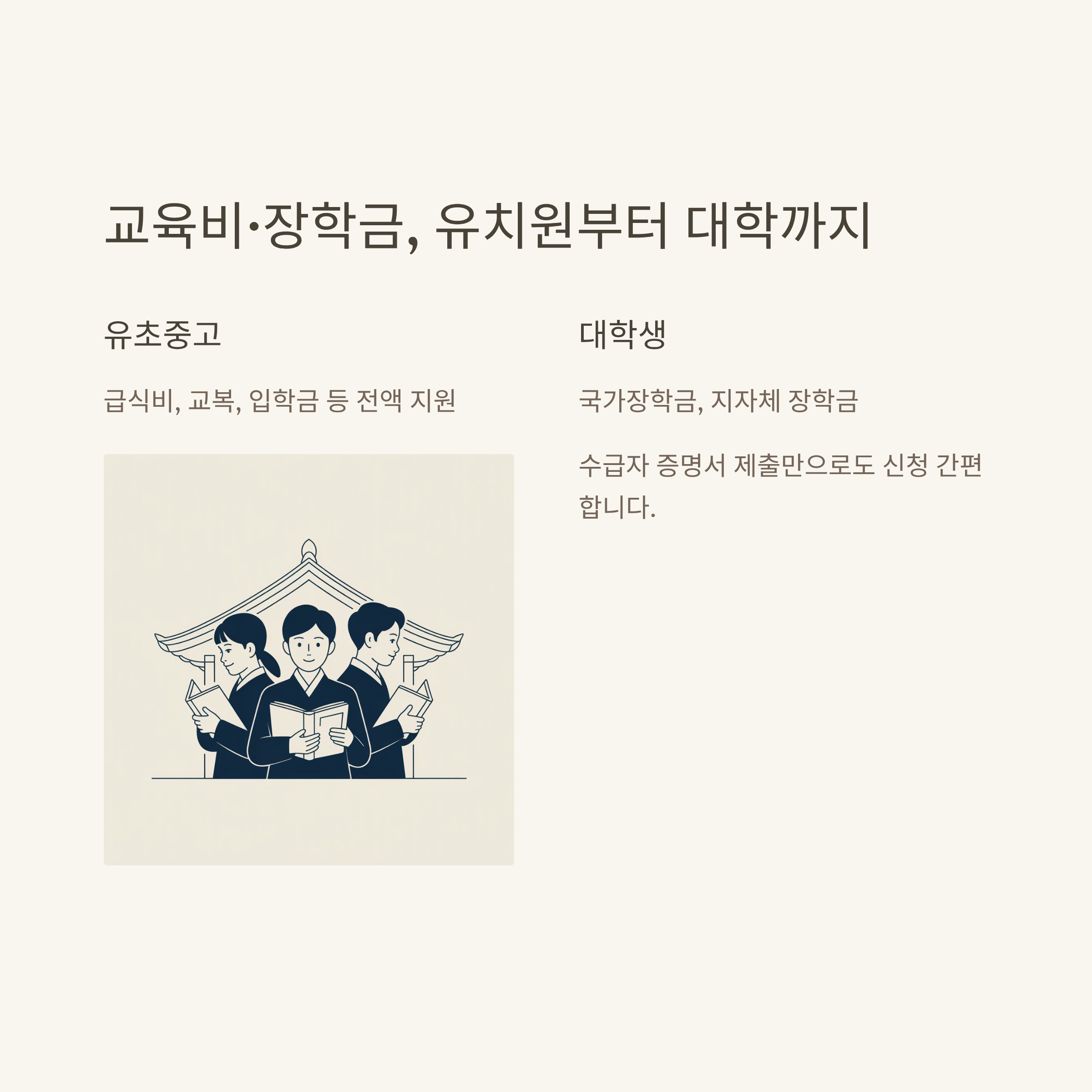 | 유·초·중·고 | 교복·교재·급식·입학금 등 전액 또는 실비 지원 | 학교 또는 교육청 신청 |