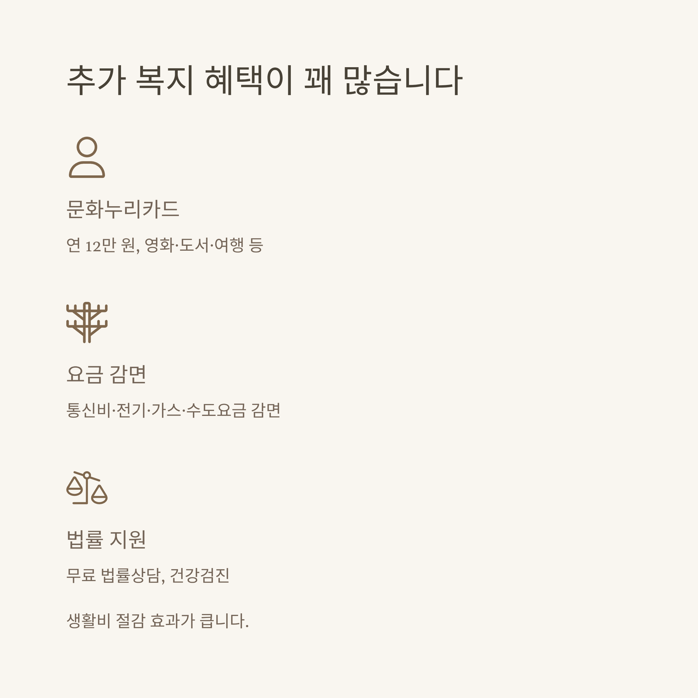 A. 문화누리카드, 통신요금·공공요금 감면, 건강검진, 무료법률상담 등 여러 추가복지서비스가 있습니다.